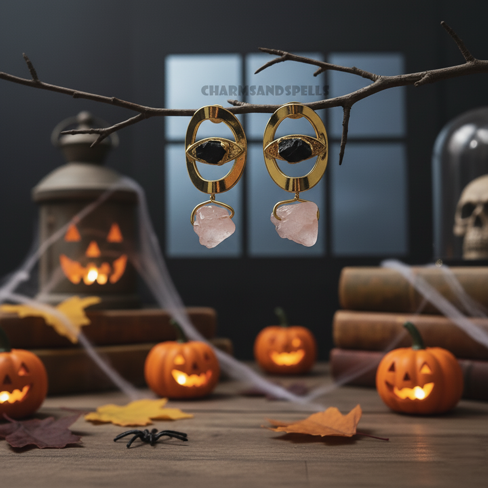 Divine Eye Rough Black Tourmaline & Rose Quartz Earrings| 14K Gold Plated