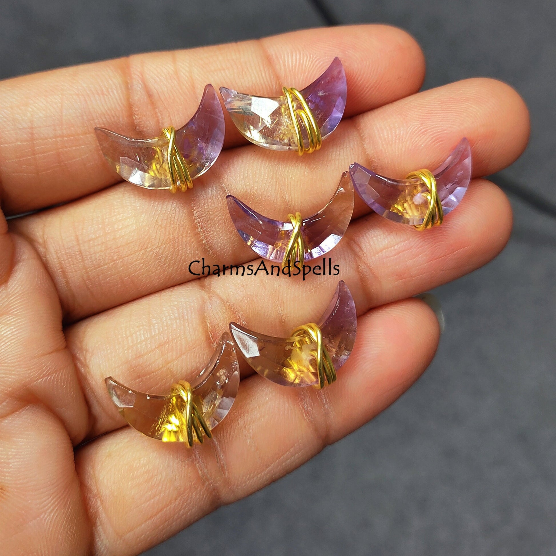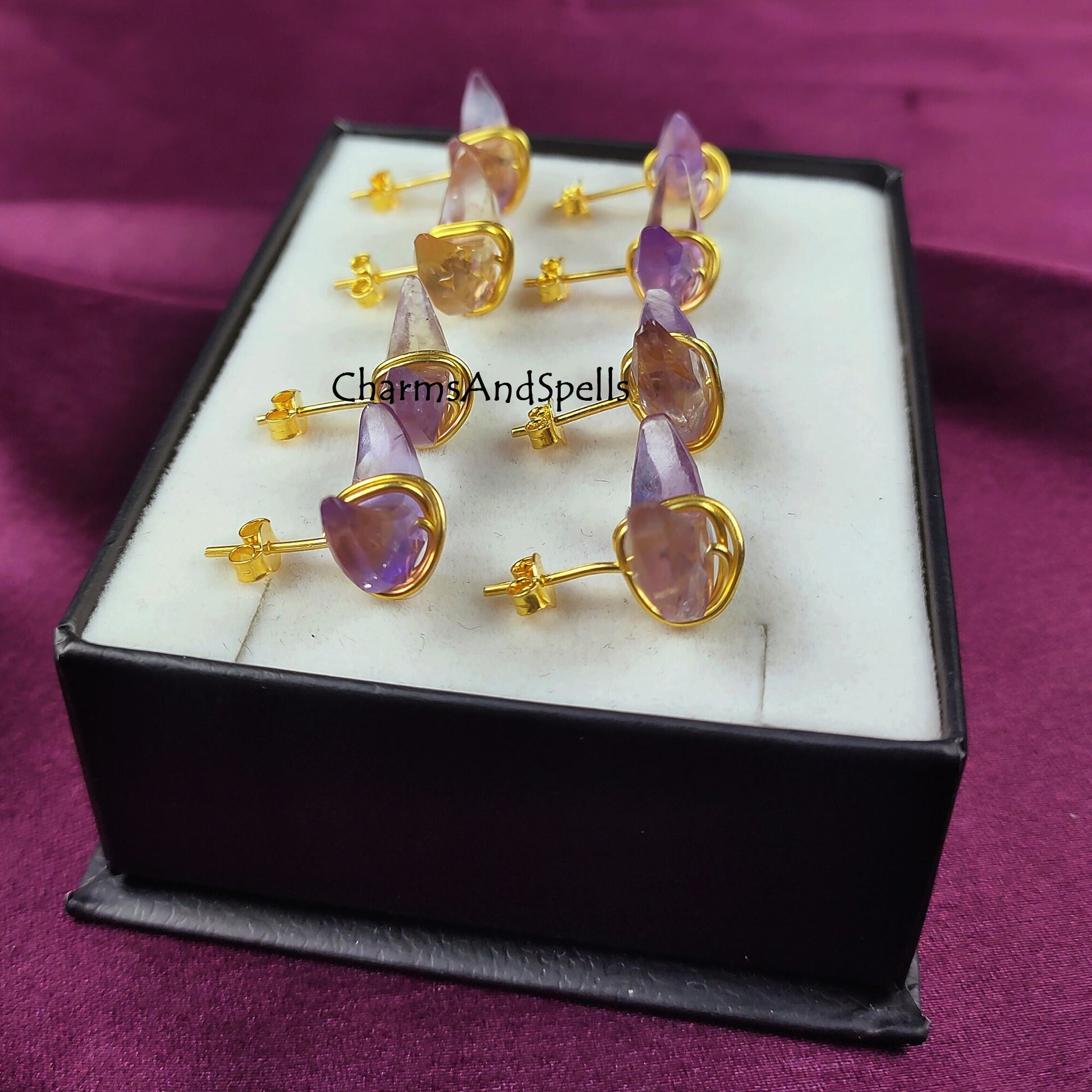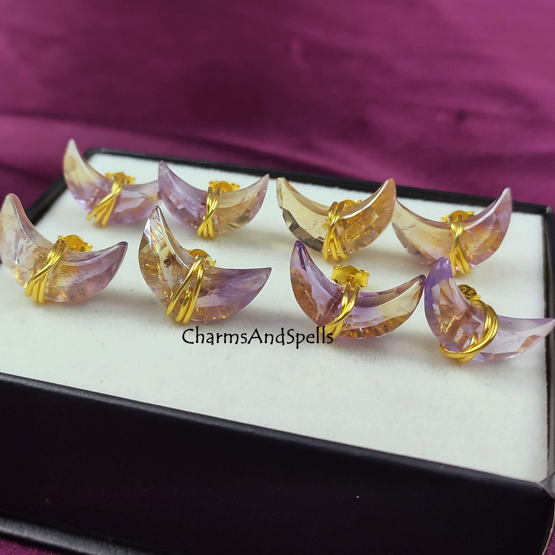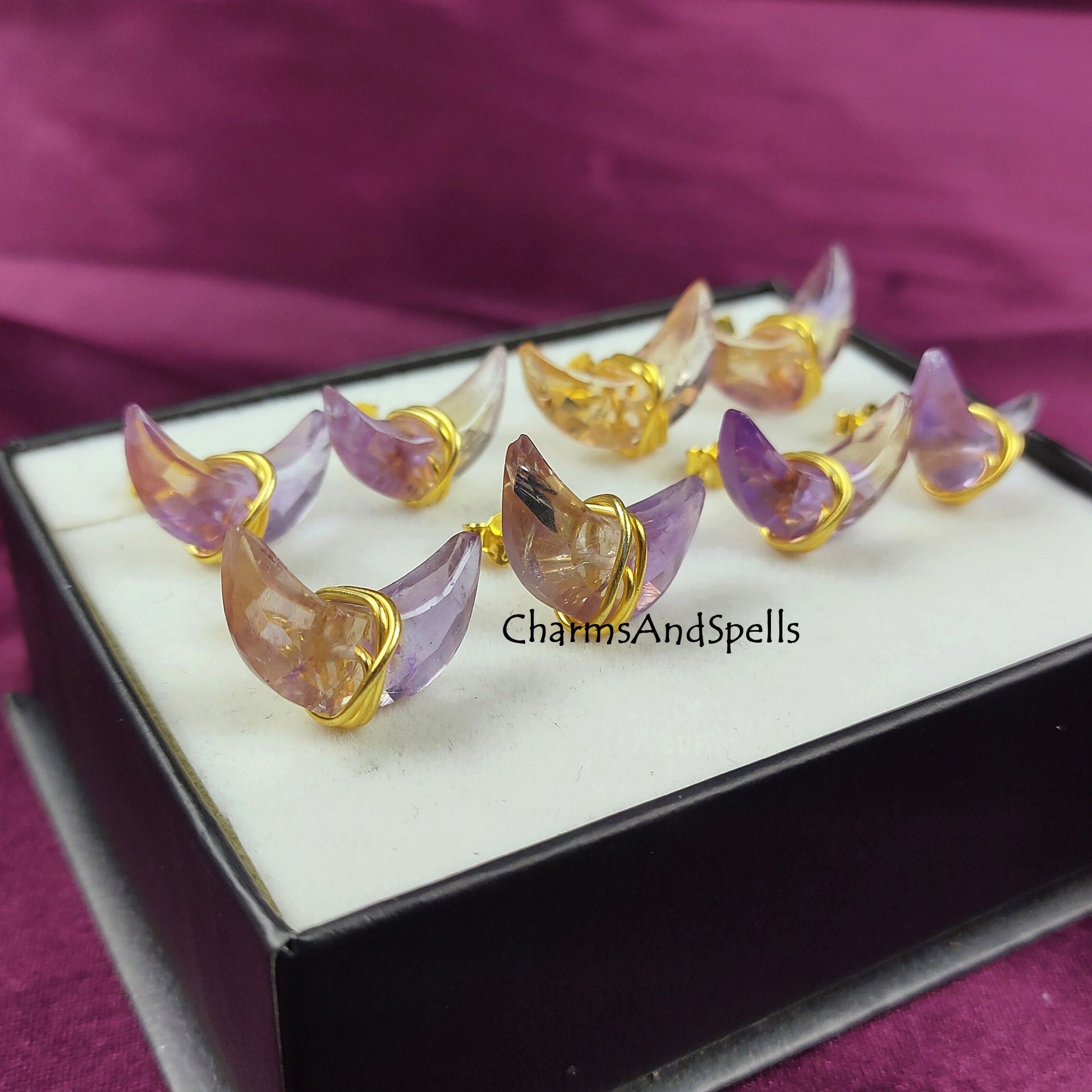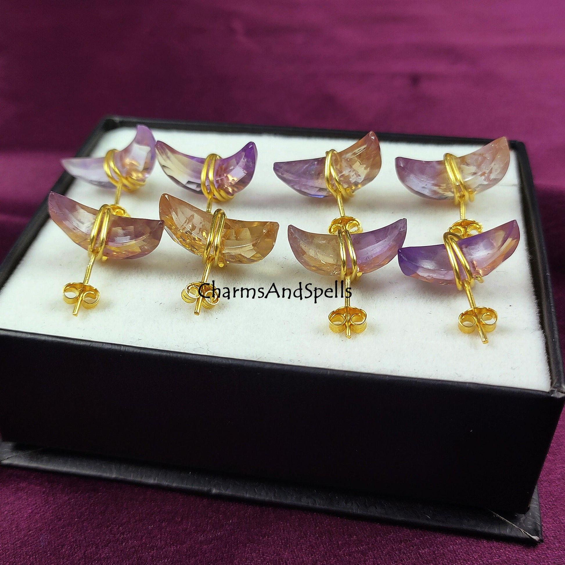 Natural Ametrine Moon Stud Earrings | 14K Gold Plated Healing Crystal | Gift