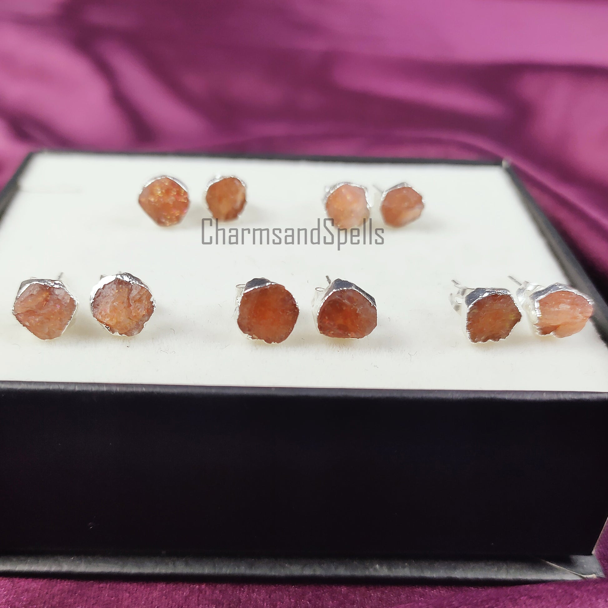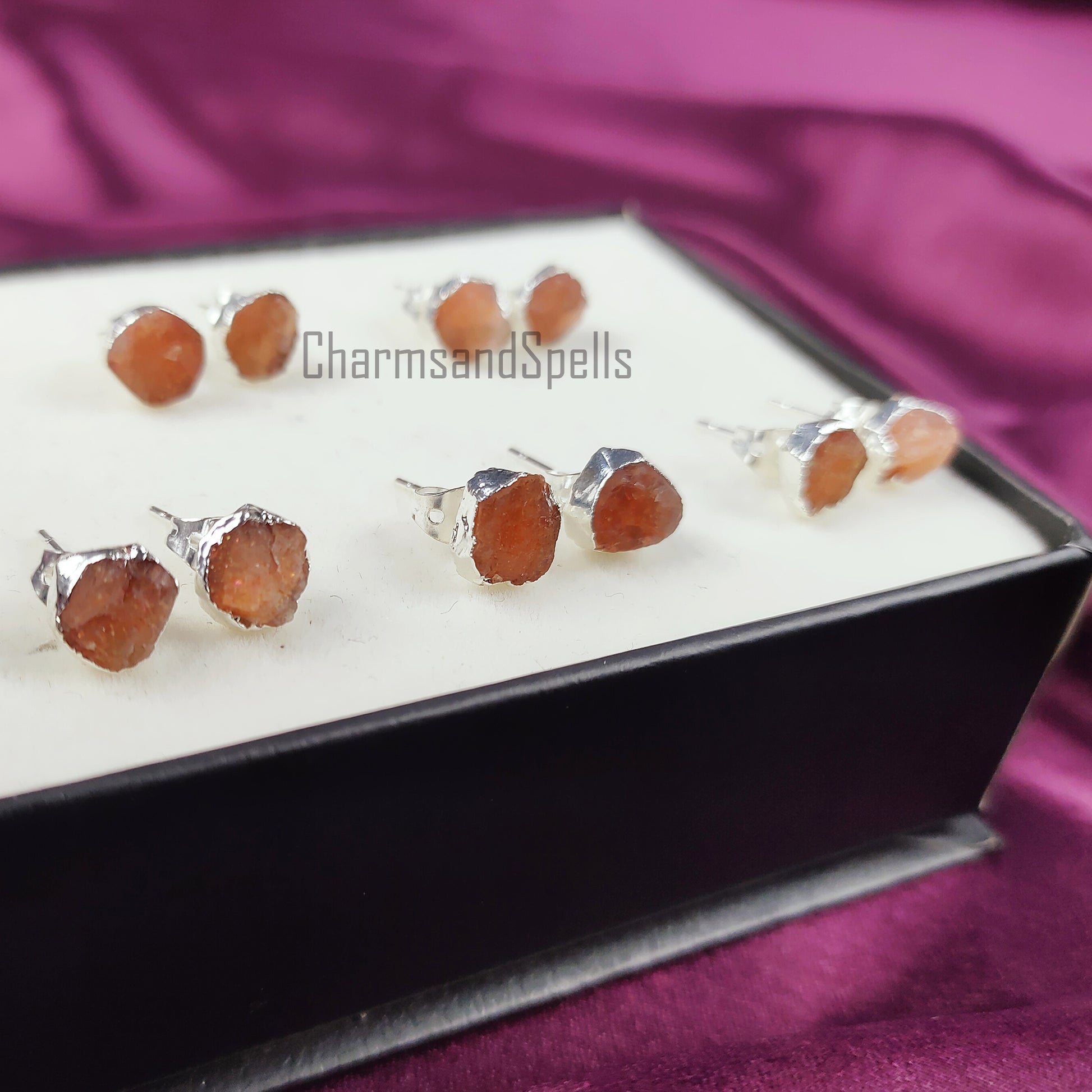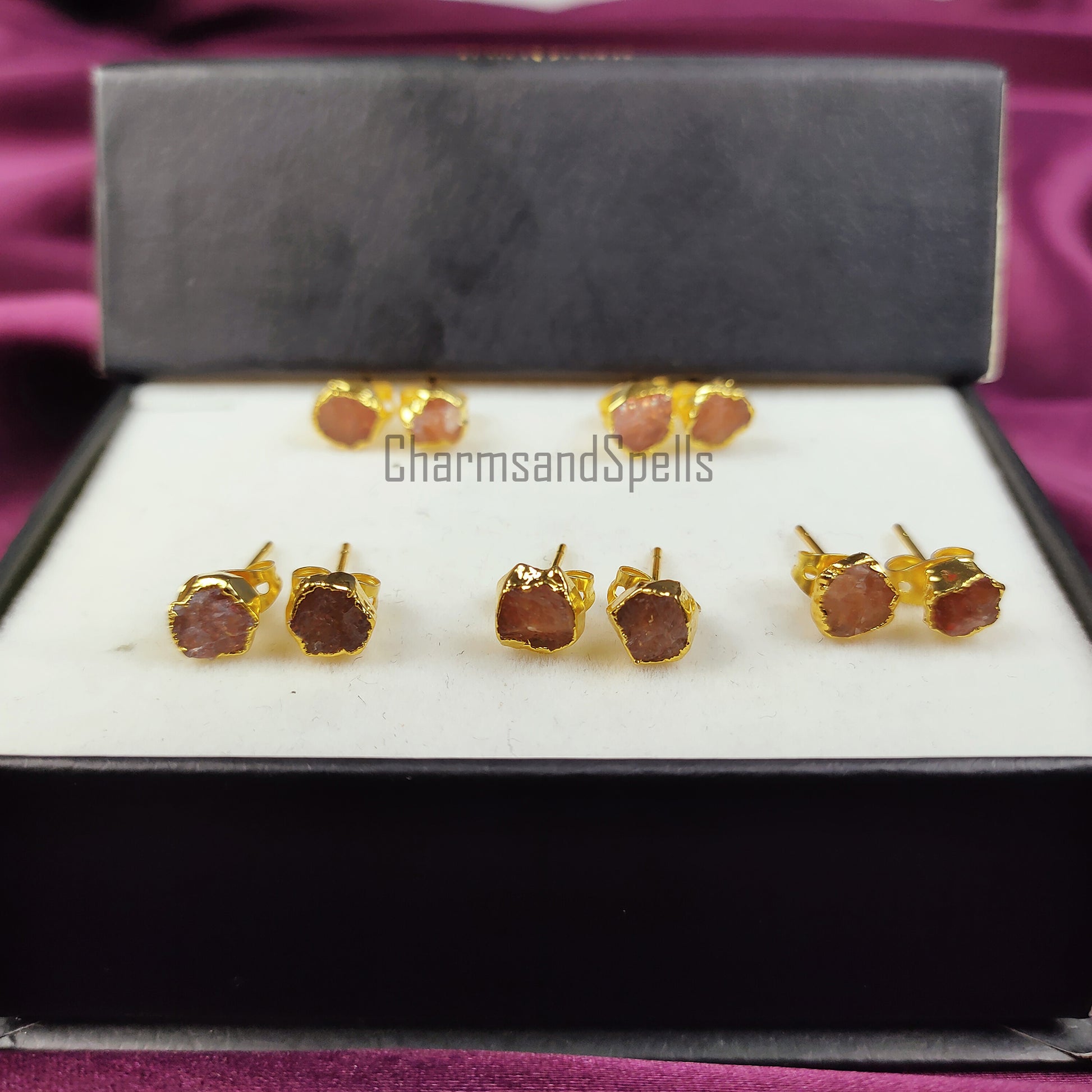 Raw Sunstone Stud Earrings | Tiny Orange Crystal Rose Gold Plated Boho Jewelry