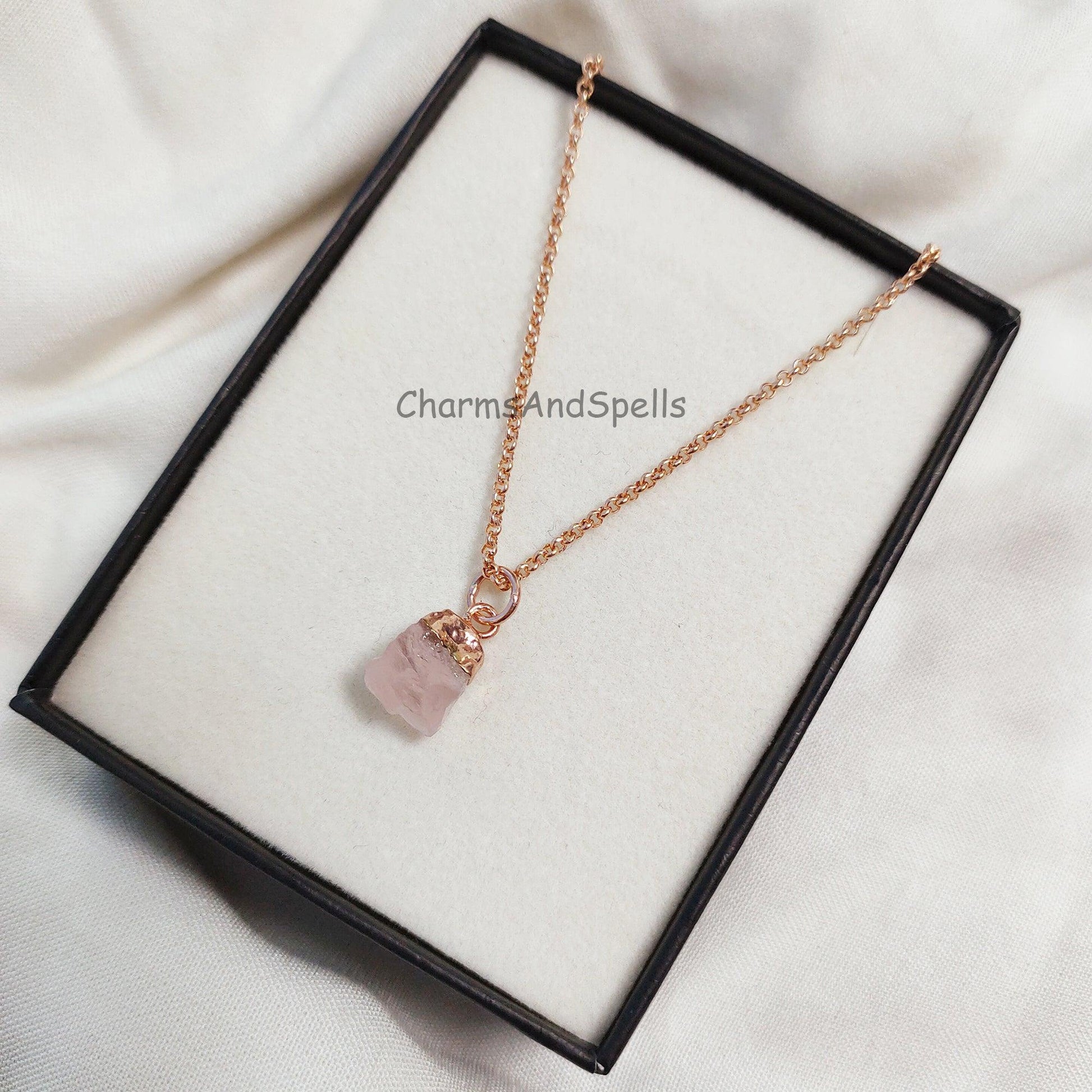 Natural Rose Quartz Necklace | Gold Plated Raw Crystal Gemstone Pendant for Women
