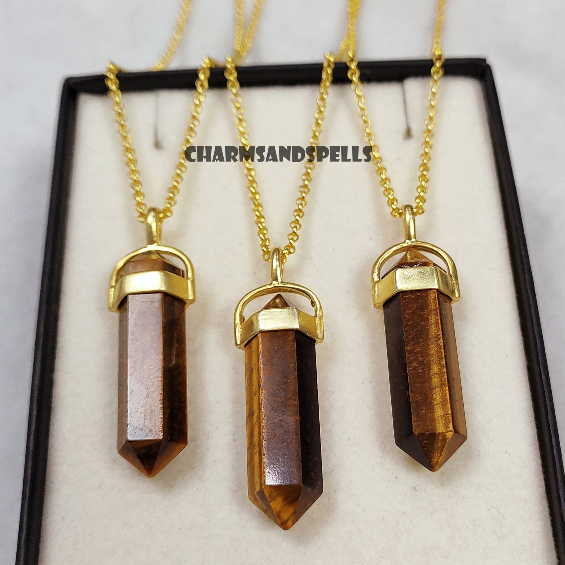 Natural Tiger Eye Crystal Point Pencil Pendant Necklace