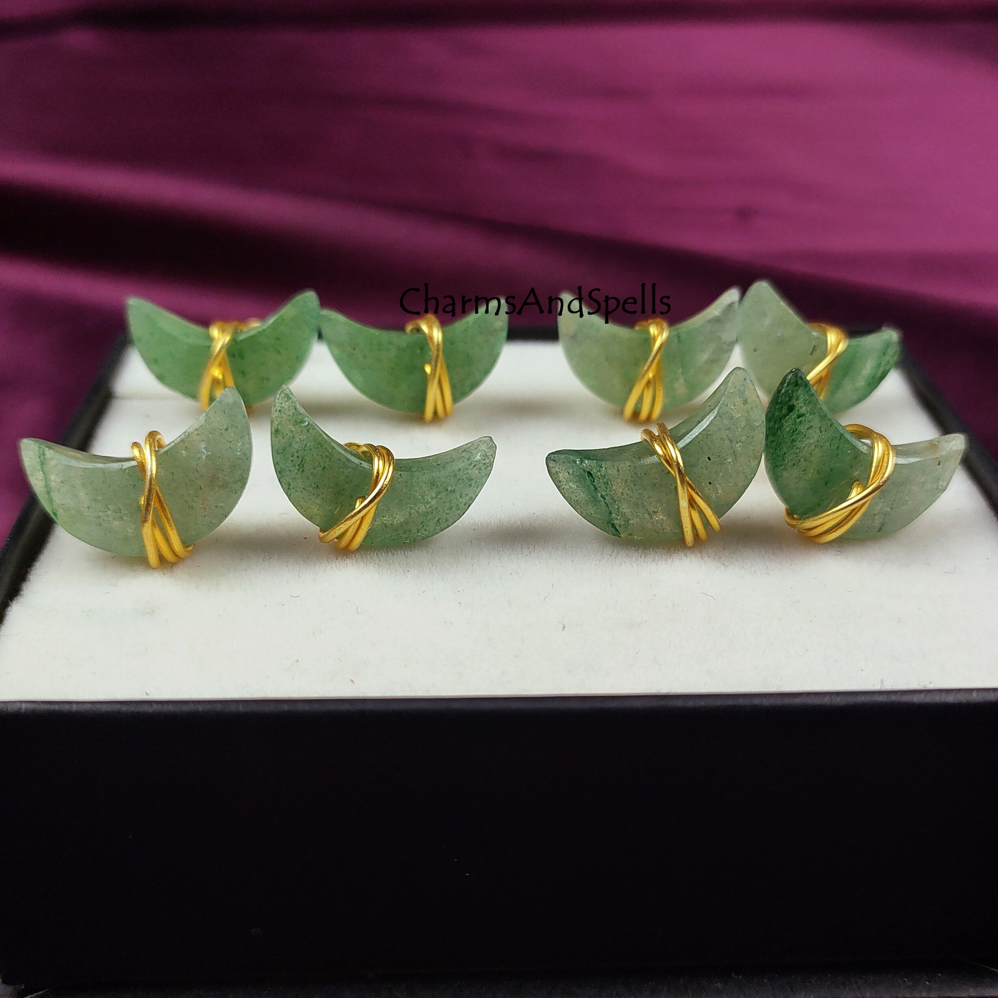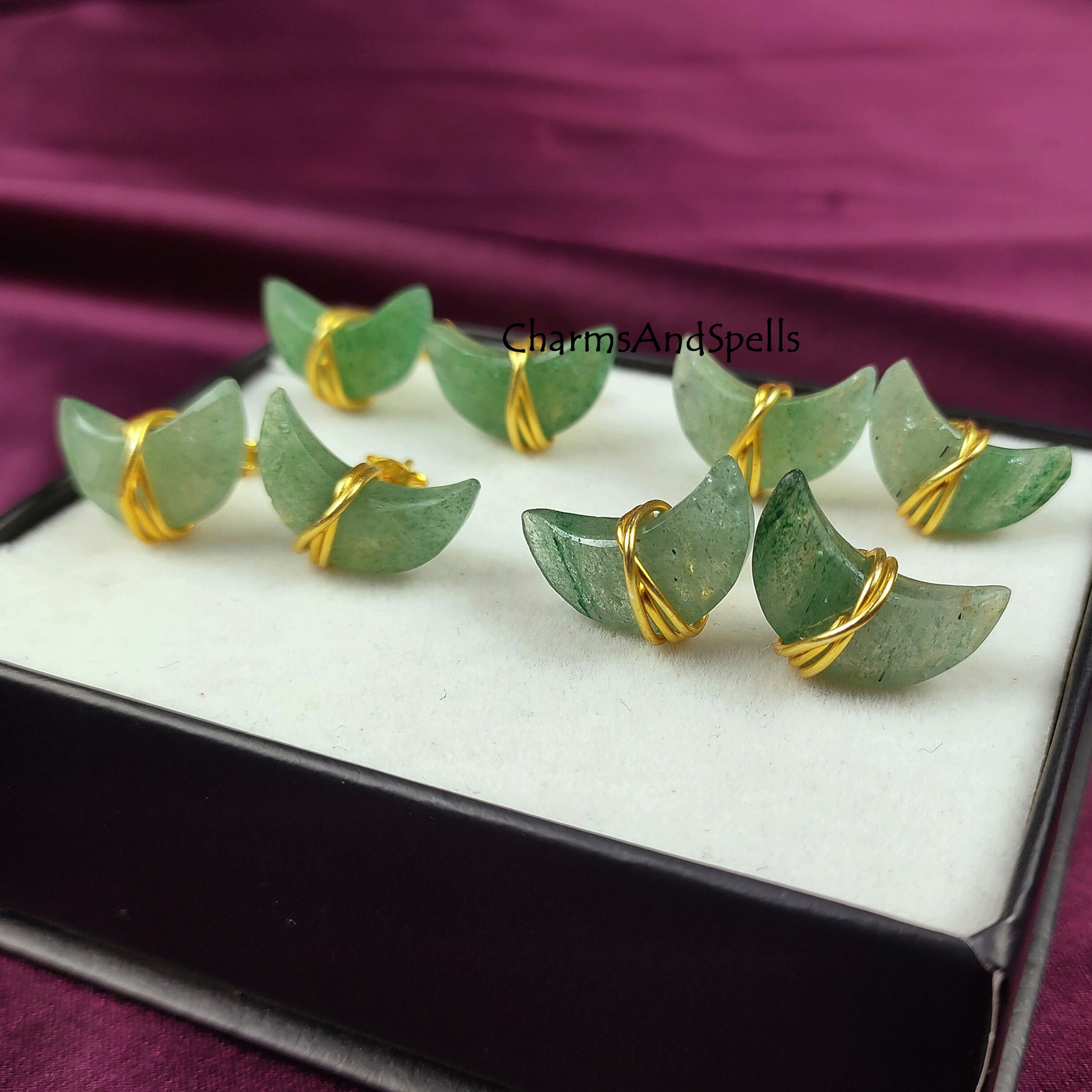 Green Aventurine Moon Stud Earrings | Wire Wrapped Crescent Healing Gemstone